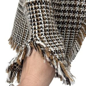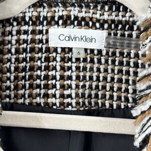 Calvin Klein Blazer Tweed Plaid Fringe Trim Open Front Jacket Black Brown White
