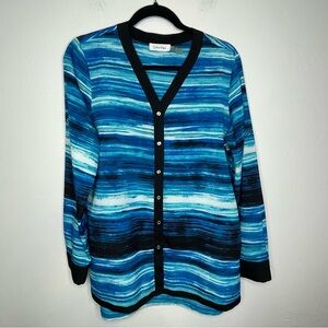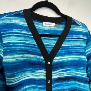 Experience the elegance of Calvin Klein with this lightweight blouse , featuring a striking blue and black color palette. The wavy striped design adds a touch of sophistication, making it perfect for both casual and polished looks. Enjoy the comfort and style of this versatile piece in your wardrobe.
