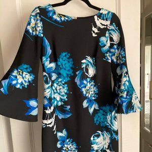 Flattering dress in quality fabric that is substantial but also forgiving with some stretch.  3/4 bell sleeve detail adds elegance.  Dress is a generous Size 6; it would fit a size 4 with roominess, and it could fit a size 8 as the fabric has some stretch.  Belt not included.
