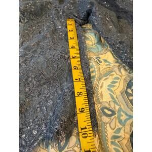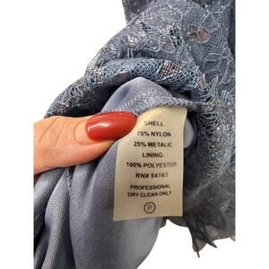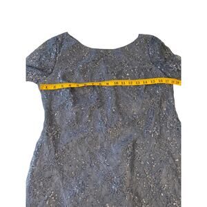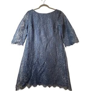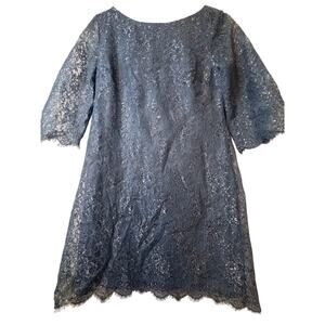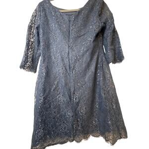 Elegant Calvin Klein lace dress in a beautiful pewter blue tone with a subtle silver metallic shimmer throughout. This refined piece features an allover floral lace overlay with delicate metallic threading that catches the light beautifully. Designed with a classic boat neckline, flattering A-line silhouette, and three-quarter lace sleeves with softly scalloped edges. The hemline falls just above the knee with a scalloped lace finish for an elevated, feminine look. Fully lined for comfort and coverage, with a hidden back zipper closure for a smooth fit. Fabric shell is 75% nylon and 25% metallic with a 100% polyester lining. Professional dry clean only. The size tag is missing, so please refer to the photos with measurements for best fit guidance. A timeless, polished dress perfect for weddings, cocktail events, evening occasions, or special celebrations. Colors and measurements may vary slightly due to lighting, display settings, or camera perspective.