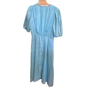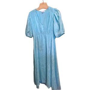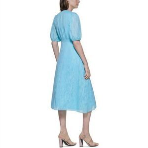 Calvin Klein Blue Metallic Calf Puff Sleeves V-Neck Midi Dress