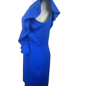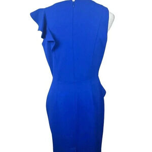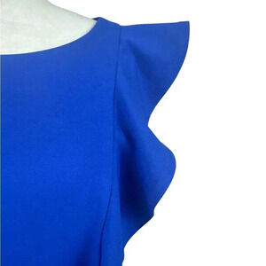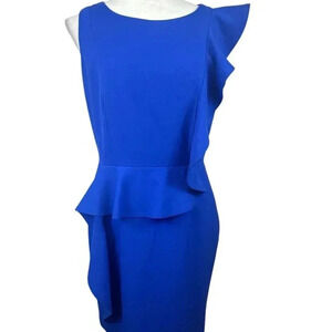 Elegant blue midi dress. Features a ruffled design. Sleeveless with a round neckline.