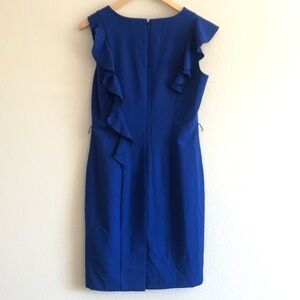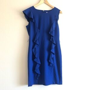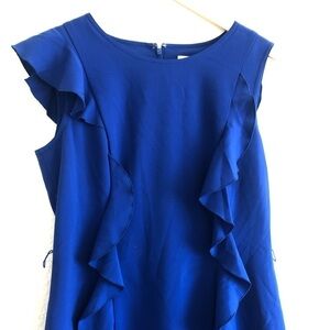 A stunning dress made by Calvin Klein. A colbolt blue shift dress decorated with some frill and small cap sleeves. A beautiful unique dress for work or parties! Hard to capture true color, last picture represents color in darker lighting, true color is probably between the 2 colors in all the pictures. Missing belt but pair with your own belt or cut off the loops!