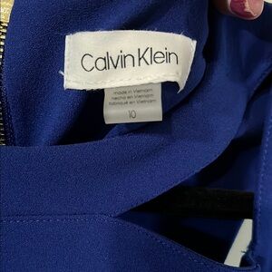 This Calvin Klein dress features a sleek sheath silhouette in a striking blue hue, perfect for cocktail events. The sleeveless design and mock neck add a touch of sophistication, making it a versatile choice for both work and social gatherings.