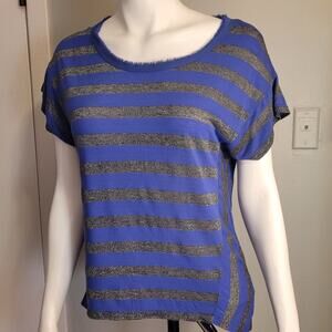 Featuring a stylish combination of blue and dark gray/silver metallic stripes, this size medium tee offers a touch of fairycore charm with its distinctive fringe collar.