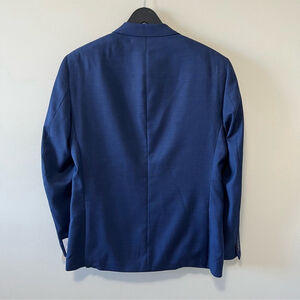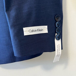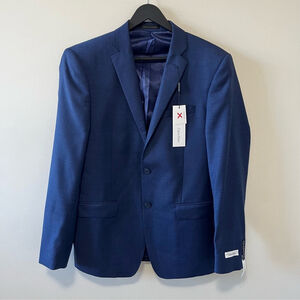 This Calvin Klein sport blazer in navy blue features a subtle texture, notched lapels, and a two-button front closure. Suitable for both business and semi-formal occasions.
