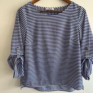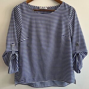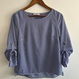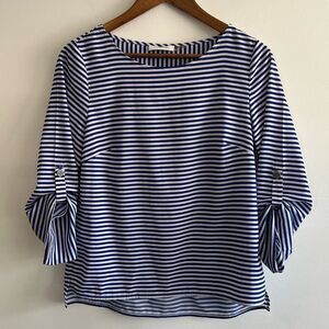 Calvin Klein blue and white stripe blouse with button cuffed up sleeves and flowy back - nautical style