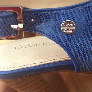 Calvin Klein blue strappy leather like feel, with thick wooden like heel, silver buckles. Worn. No scuffs.