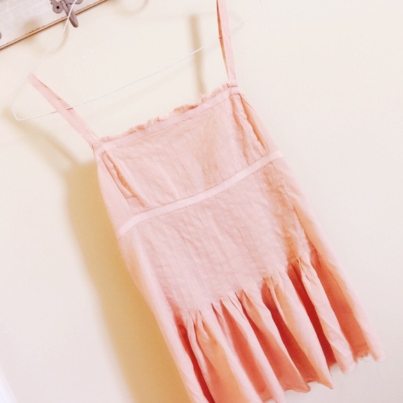 Gorgeous vintage blush color with distressed hemming on bottom and neckline and pleaded detail in front .... Side full zip up closure and adjustable button shoulder straps... In perfect condition! Not J crew *