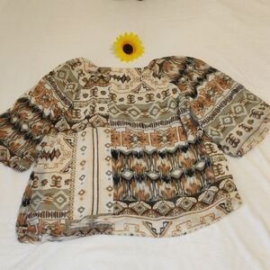 Chic bohemian blouse with intricate patterns. Features a mix of earthy tones.