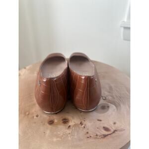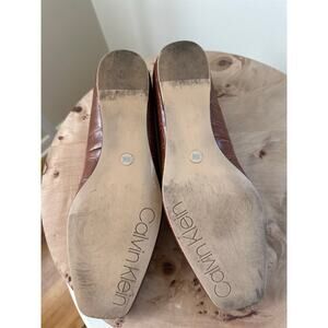 Classic Calvin Klein flats with a modern square toe and croc-embossed finish. Neutral brown shade makes them versatile for work or casual wear. Lightly worn soles, overall great condition.