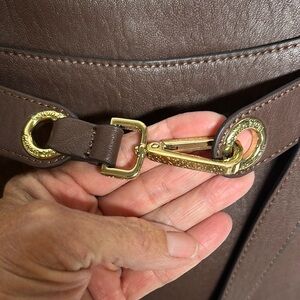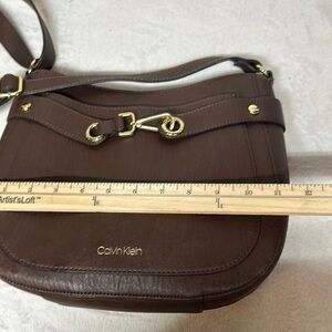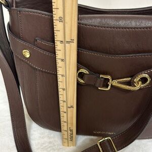 This Calvin Klein shoulder bag showcases a rich brown color and a stylish hobo silhouette, complemented by elegant gold-tone hardware. Its smooth texture and practical size make it an ideal choice for everyday use, adding a touch of sophistication to any outfit. See all photos as they are part of description