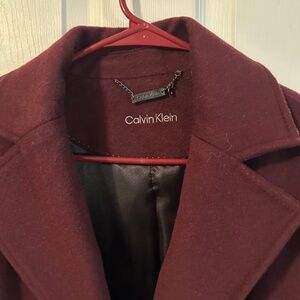 Calvin Klein burgandy color pea coat style. Size 6. 63% wool with a satiny feeling interior lining made of polyester.