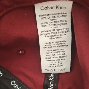 Burgundy cap featuring Calvin Klein logo. Classic and versatile design.