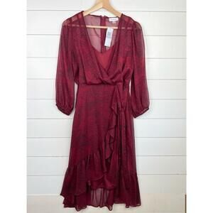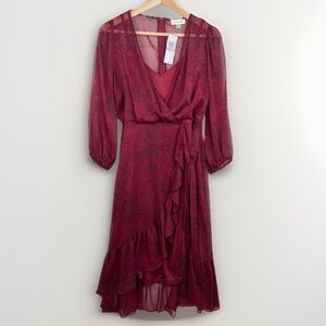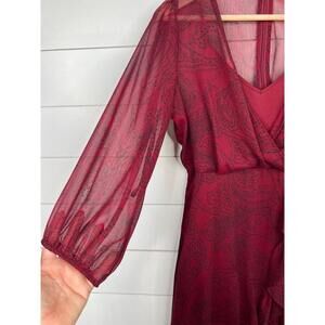Calvin Klein Burgundy Paisley Ruffle Sheer Midi VNeck Wrap Dress Size 8