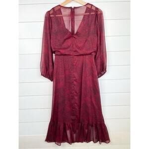 Calvin Klein Burgundy Paisley Ruffle Sheer Midi VNeck Faux Wrap Dress Size 8
