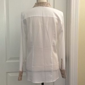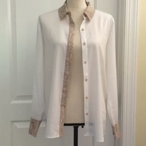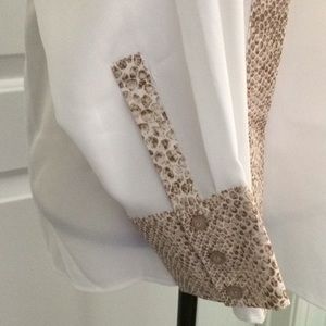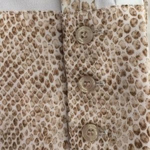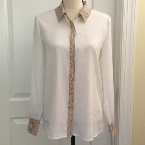 BNWOT (still has crisp creases on sleeves) Calvin Klein button down blouse with snake accent print on collar and wrists. Sleeves can fold and be held at 3/4 length like most blouses. Size tag was snipped off but it’s an XS (but could fit a small) just like my other Calvin Klein blouse listing. Photos may have yellow tint due to me taking them in the morning with an overhead light on