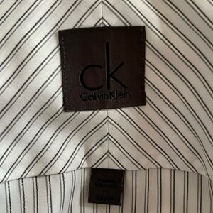 Calvin Klein button-down dress shirt in white and gray stripes.