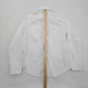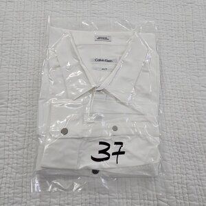 This Calvin Klein Button Up Shirt for men in size M features a slim fit design with a collared neckline and long sleeves. Made from woven cotton fabric in a solid white color, this shirt is perfect for various occasions including casual, formal, business, and party/cocktail events. With a spread collar and accentuated buttons, this shirt also includes pockets and is machine washable for easy care.