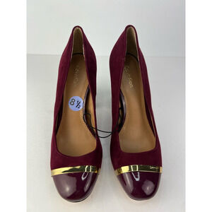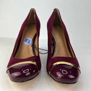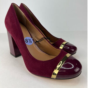 Calvin Klein Carlia Womens Sz 8.5 Burgundy Gold Block Heels Suede Patent Cap Toe Pumps