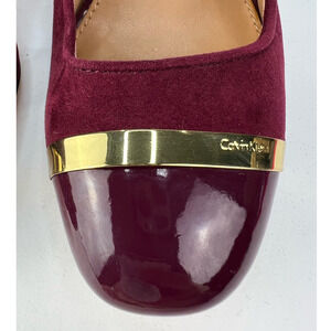 Calvin Klein Carlia Womens Sz 8.5 Burgundy Gold Block Heels Suede Patent Cap Toe