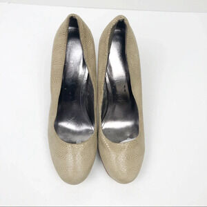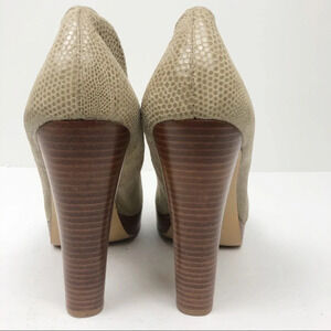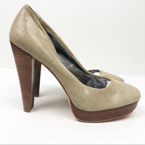 In great condition. Snakeskin textured heels or pumps. Round toe. Faux stacked wood heel. Platform at the front makes the height comfortable. Inside of shoe lining is slightly cracking, but does not affect the look or function. See pics.