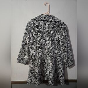 Elevate your professional wardrobe with the Calvin Klein Open Blazer, a timeless piece that effortlessly combines business sophistication with a touch of casual flair. Designed for women, this size 6 blazer features a distinctive cascading collar and 3/4 sleeves, providing a modern twist to traditional jacket designs. The black and white animal print adds a subtle edge, making it a versatile addition to your clothing collection.