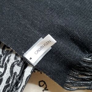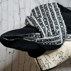 Calvin Klein Chain Print Scarf in black and white with solid black back and fringe at the ends. Measures appx 80 inches by 12 inches. 100% acrylic.