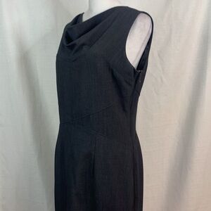 Stunning charcoal gray shift dress by Calvin Klein. Cowl neck leads to a beautifully stitched bodice. Started along the waistband to best contour your fit. Side exposed zipper closure from both ends. You can wear the skirt fully zipped or unzip it for a bit of a vented side. Fully lined and polyester fabric so this will work great with a bear leg or with Nylons. Dry clean only. Retail: $165