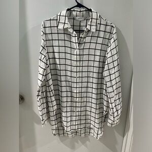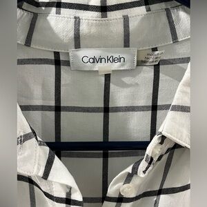 Calvin Klein Checkered Button Up Shirt, size small. Stylish Calvin Klein shirt with a classic checkered pattern. Perfect for any occasion. Slightly longer in the back, lightweight, soft and comfortable. Features sleeve tabs for easy sleeve roll ups. Size tag is missing, but it was a small. It’s oversized and measures 19 inches pit to pit. Great condition. Questions? Message me.