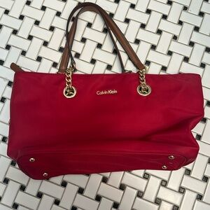 Elegant Calvin Klein tote in vibrant cherry red. Features gold chain accents and sturdy handles. Perfect for daily use.