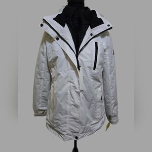 Calvin Klein Elegant white jacket with black accents and a cozy hood. NWT Size S / *** please note a small mark on hood which I am sure can be probably washed off***