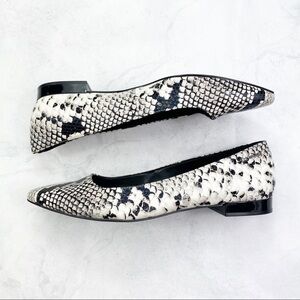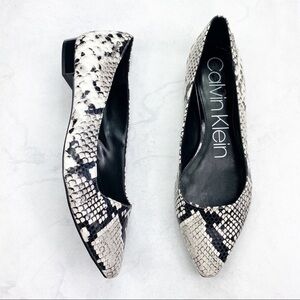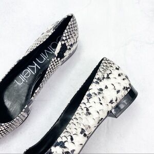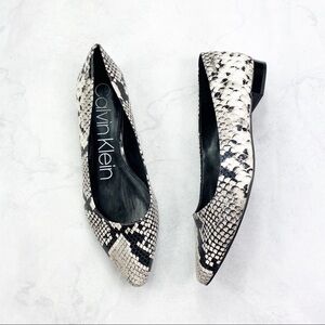 Calvin Klein Classic Snake Print Flat. Almond Toe. Allover Snake Skin Print. Slip-On Style. Padded Footbed. Leather Material. Super Cute & Comfy. No Stains or Rips. New. Never Worn.