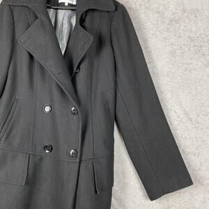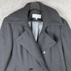 Stunning Calvin Klein wool-blend coat in classic black. Features a double-breasted front, wide lapel collar, and tiered hem that creates a chic fit-and-flare silhouette.
