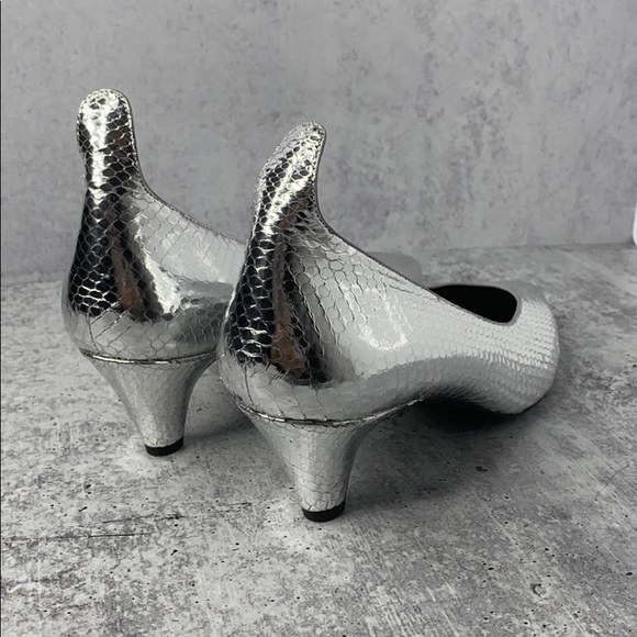 Styled with a pointed toe, CALVIN KLEIN 205W39NYC's Kait pumps are assembled from metallic silver python and accented with an extended pull tab at the heel counter. The pair's unique silhouette references the American label's Art Deco-themed collection.