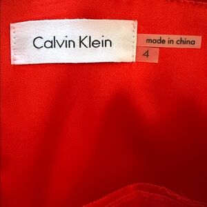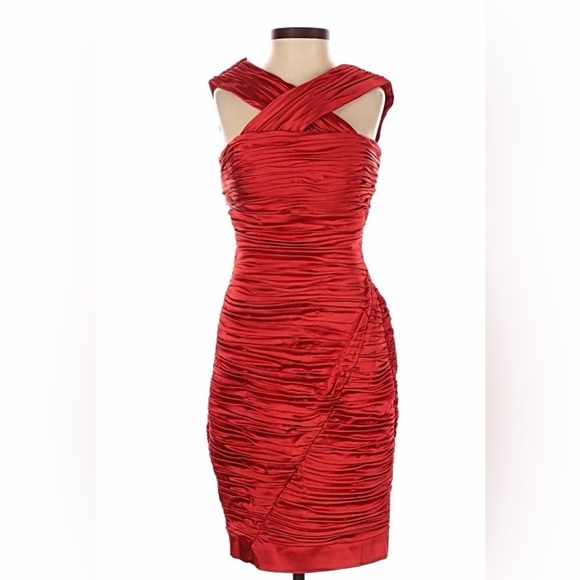 Chic red mini dress with ruched detailing. Striking design by Calvin Klein with a crisscross neckline. Ideal for standout style.