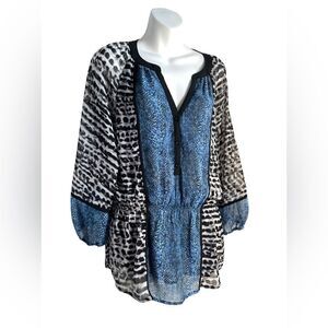 Calvin Klein animal print color block flowy blouse with an open V-neckline and black trim. The front has a partial button closure. The color block design features a black and white tie-dye zebra print alongside a blue snake print. The main sections are lined, but the sleeves are not. Ruching at the waist creates a boho look, and there is elastic at the waist and sleeve cuffs. Three-quarter sleeves.