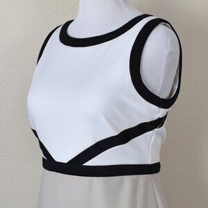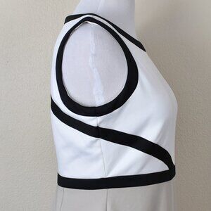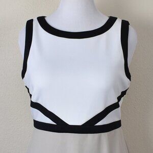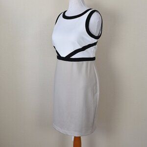 Scuba-like material, more flexible. Stretch material. Bodice lined. Back zipper. Beige, white, and black colors. Sleeveless.
