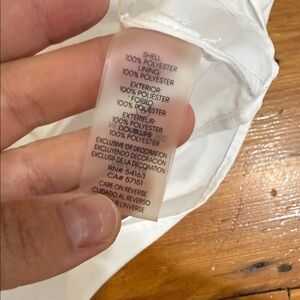 Elegant Calvin Klein blouse in cream. Features embellished bell sleeves. Perfect for a refined look. Preowned. Pearls and beads on the sleeves!