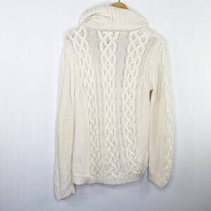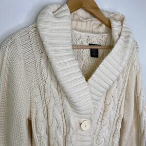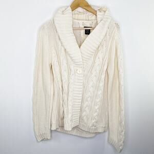 Cream shawl collar knit long sleeve sweater. Cable knit with ribbed trim, button closure, long sleeves.