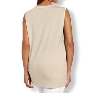 Calvin Klein Cream Tan Mixed-Media Blouse size XL. Sleeveless top in color-blocking with split-neck collar featuring chest flap and high/low hemline. Great condition. Stretchy. Smoke-free. Fast shipper.