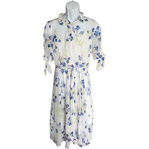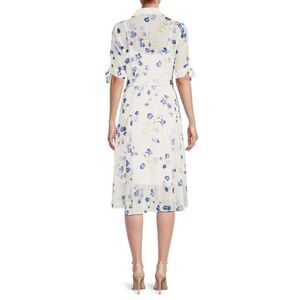 Chic midi dress with floral design. Features a tie waist and button-up front. Ideal for versatile wear.