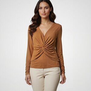Calvin Klein Crepe V-Neck Long Sleeve Twist Front Blouse XL Luggage Camel NWT