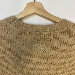 Ribbed collar and hem. Gold metallic shimmer. Pullover Style. Acrylic 65% Polyester 28% Metallic 5% Spandex 2%