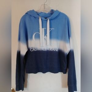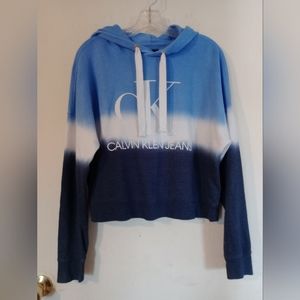 Great little crop top Hoodie by Calvin Klein. Size Small. Tie Dye shades of blue. Great pre-owned condition. Pit to pit measurement is 25 inches and length is 21 1/2 inches. AA18