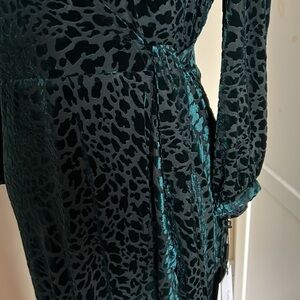 Calvin Klein, velvet, burnout, faux wrap, flounce hem, dark green, animal print, feminine, pretty