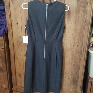 Brand new sheath dress designed with soft denim fabric and a gold hardware back zip. Round neck. Tonal topstitching. 39" from shoulder to hem. Perfect for work, semi-formal gatherings, or anytime you wish to elevate your look!