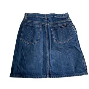 Step back in time with this classic vintage Calvin Klein denim skirt from the 1970s! This timeless piece features a button and zip fly, stylish embroidered pockets, and convenient belt loops. Made from 100% cotton, this skirt offers both comfort and durability. While it shows minor signs of wear throughout, it's in great vintage condition, ready to be a cherished part of your wardrobe. Made in the USA.