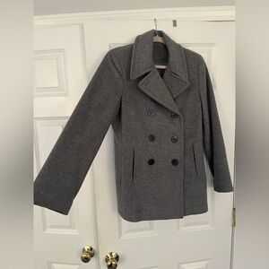 Double breasted gray peacoat. Excellent condition. Wool/nylon shell with silk lining. Size 8, true to size.