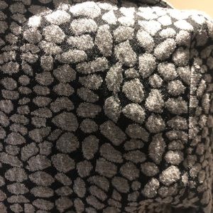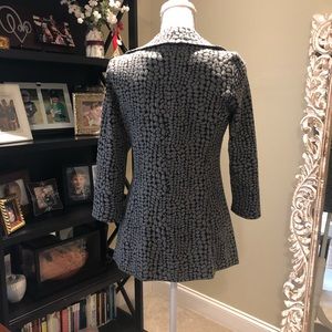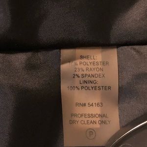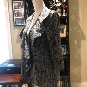 Jacket is in like-new condition. It is fully lined and features 3/4 length sleeves and a ruffled open front. Fabric is 83% polyester, 16% rayon and 1% spandex. Lining is 100% polyester. Jacket length is 27”. Sleeve length is 19”.